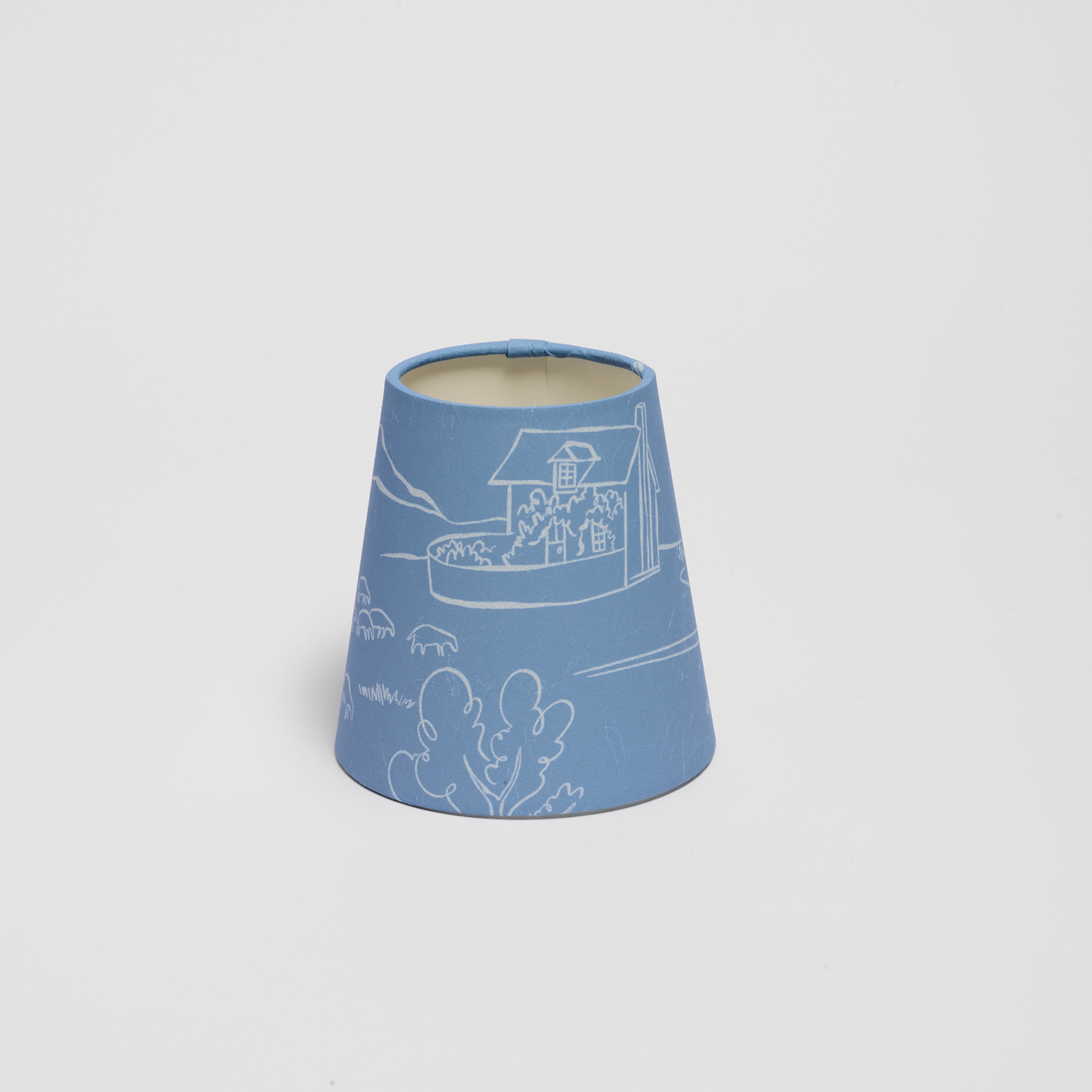 This little Empire paper shade is made of finest Belgium wallpaper with a fire-resistant lining inside. It Is completely handmade in England and the edges have a hand rolled finish. A candle bulb works best for this shade. This lampshade is made of our wallpaper Helford NIMES We had a Cornish landscape drawn up, which almost looks like a mural – our Cornish answer to a Toile de Jouy. Also check out the other colourways – Ferry Blue, Rust, Canopy and Overcast.