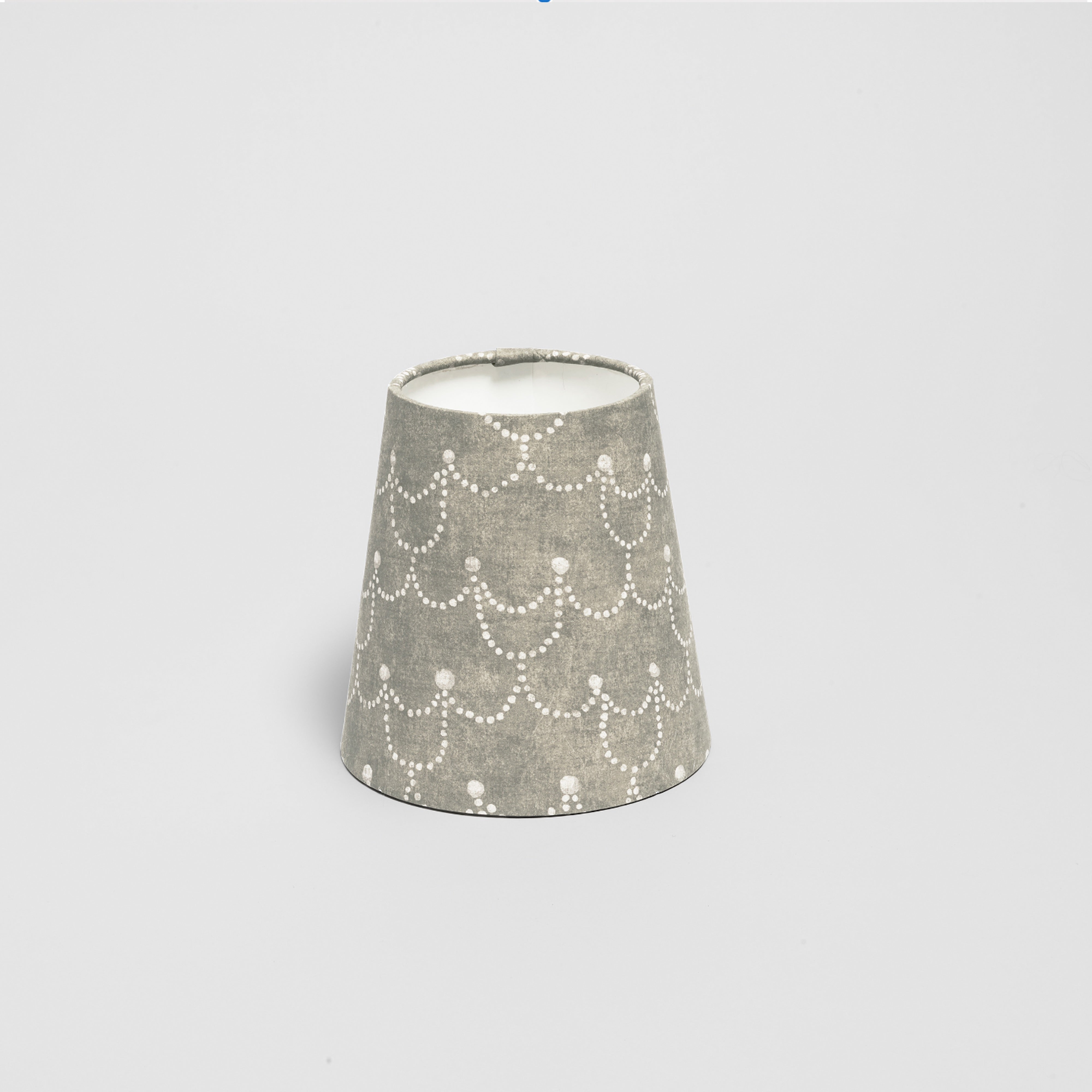 This little Empire paper shade is made of finest Belgium wallpaper with a fire-resistant lining inside. It Is completely handmade in England and the edges have a hand rolled finish. The shade works perfectly for wall lights or smaller table lamps. A candle bulb works best for this shade. This lampshade is made of our wallpaper Pearl Chain GRIGIO. The original design evolved through careful watercolour painting — layer by layer — to capture the perfect balance of tone, pattern, and scale.